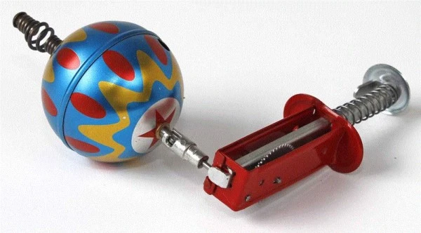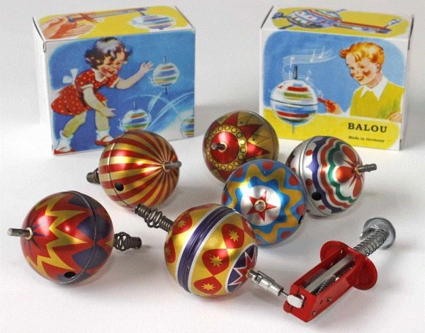 Balou begeistert Groß und Klein mit tollen Farben und nostalgischem Charme! Mit dem dazugehörigen Abschussgerät wird der Hüpf- und Singkreisel von DBS Blechspielwaren auf eine hohe Drehzahl gebracht und losgelassen. Erst hüpft der Kreisel auf und ab durch die Sprungfeder am Boden, dann kreiselt er verblüffend schnell weiter und „singt“ dazu. Ein faszinierendes Technikspielzeug ganz aus Blech, das zum selber ausprobieren verführt. Allerdings muss darauf hingewiesen werden, dass kleine Kinder sich am Blech schneiden könnten und es sich deshalb nicht um ein Kinderspielzeug handelt. „Nicht geeignet für Kinder unter 14 Jahren“ heißt es auf der Packung. Wir von Fips finden Balou ist ein absolutes Schmuckstück unter den Blechkreiseln, der in tollen Mustern und Farben erhältlich ist (im Set mit je 6 verschiedenen Farben). Darf bei keinem Kreiselfan in der Sammlung fehlen!