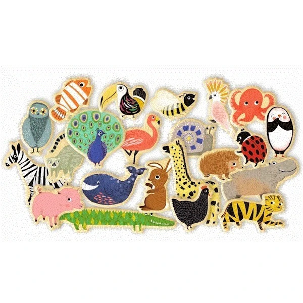 Die farbenfrohen und bunt gestalteten Holzmagnete von der Marke Djeco helfen Ihrem Kind auf spielerische Art und Weise seine Beobachtungsgabe und Koordination zu fördern. Ob für die Magnetwand im Kinderzimmer oder für den Kühlschrank in der Küche – die Magnete bedeuten Spielspaß für die ganze Familie! Mit den 42 kunterbunten Motiven rund um das Thema Tiere lässt sich eine tolle Tierwelt aufbauen und gestalten. Ob Fisch, Eule, Nilpferd, Zebra, Krokodil, Marienkäfer, Hase, Pinguin und viele mehr – es ist für jeden Geschmack etwas dabei. Die Magnete bieten unzählige Möglichkeiten, um immer wieder neue Kombinationen umzusetzen. Der Phantasie der Kinder sind dabei keine Grenzen gesetzt.