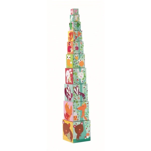 Das Stapelspiel „Forest Blocks“ von der Marke Djeco. Es besteht aus 10 Würfeln, die mit wunderschönen, bunten Motiven bedruckt sind und stapelbar sind. Die Würfel können ebenso ineinander gesteckt werden, es passt genau. Jede Seite der Würfel präsentiert sich in einem anderen Design: mal Tiere, Waldfrüchte mit Zahlen oder ein Baum, der sich durch alle 10 Würfel zieht. Ein wahrlich hübsch gestaltetes Stapelspiel für Kinderhände aus Künstlerhand!