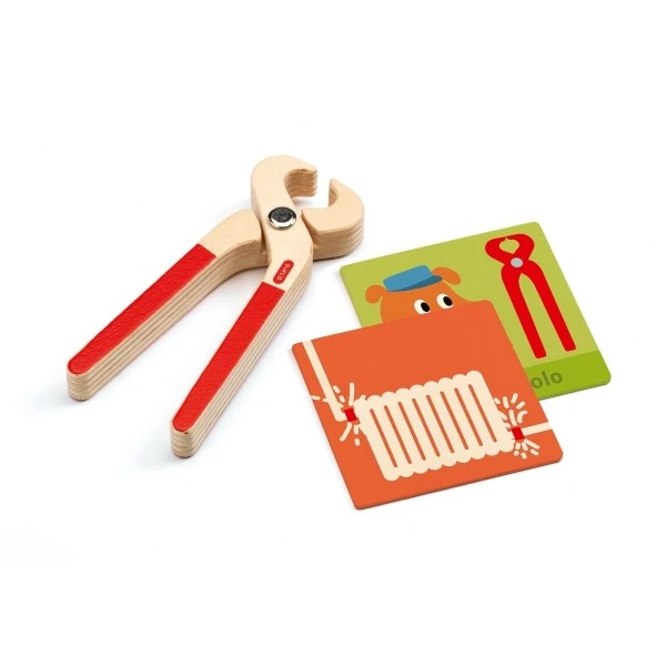 Mit dem Djeco Werkzeugkasten Super Bricolo lernen die Kids spielerisch, welche Werkzeuge für welche Situationen benötigt werden. Zuerst ziehen sie eine Karte, die eine Situation abbildet. Anschließen muss das passende Spielzeug-Werkzeug gefunden werden.
