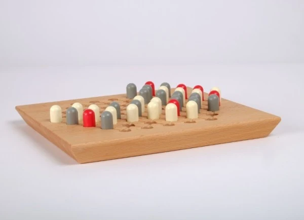 • Spielsteine sind Holzstecker in rot, weiß und grau