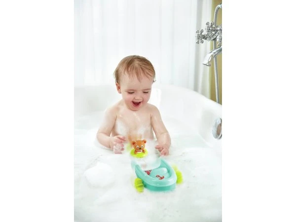 Dieses witzige Schlauchboot mit Rückziehmotor von Hape ist ein großer Badewannenspaß! Zieht man den Bär an der Schnur heraus und lässt los, startet man so den Antriebsmotor des Bootes. Die Schaufelräder drehen sich, das Boot fährt und zieht den Bär mit Rettungsring hinterher