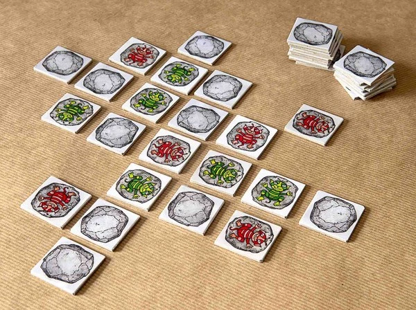 Das Spielprinzip ist also eigentlich ganz leicht. Zwei Steine werden umgedreht, es wird nach Zwoggelreihen geguckt und anschließend drei neue Steine verdeckt angelegt. Hat man Glück, dann baut man so für seine Mitspieler hervorragende Zwoggelfallen.