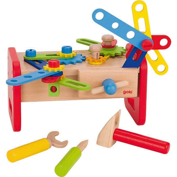 Hier können kleine Handwerker und Handwerkerinnen ab 3 Jahren schon mal üben, was später mit echtem Werkzeug passiert. Mit Hammer, Schraubendreher und Maulschlüssel werden die entsprechenden Schrauben und Holznägel bearbeitet. An der kleinen Werkbank befindet sich auch ein Schraubstock, mit dem die Teile eingespannt werden können.